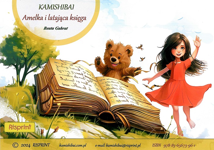 Amelka i latająca księga : kamishibai / Beata Gabrat. - [Płock] : Risprint, © 2024. - Teka (12 kart tablic luzem) : ilustracje ; 30x42 cm.